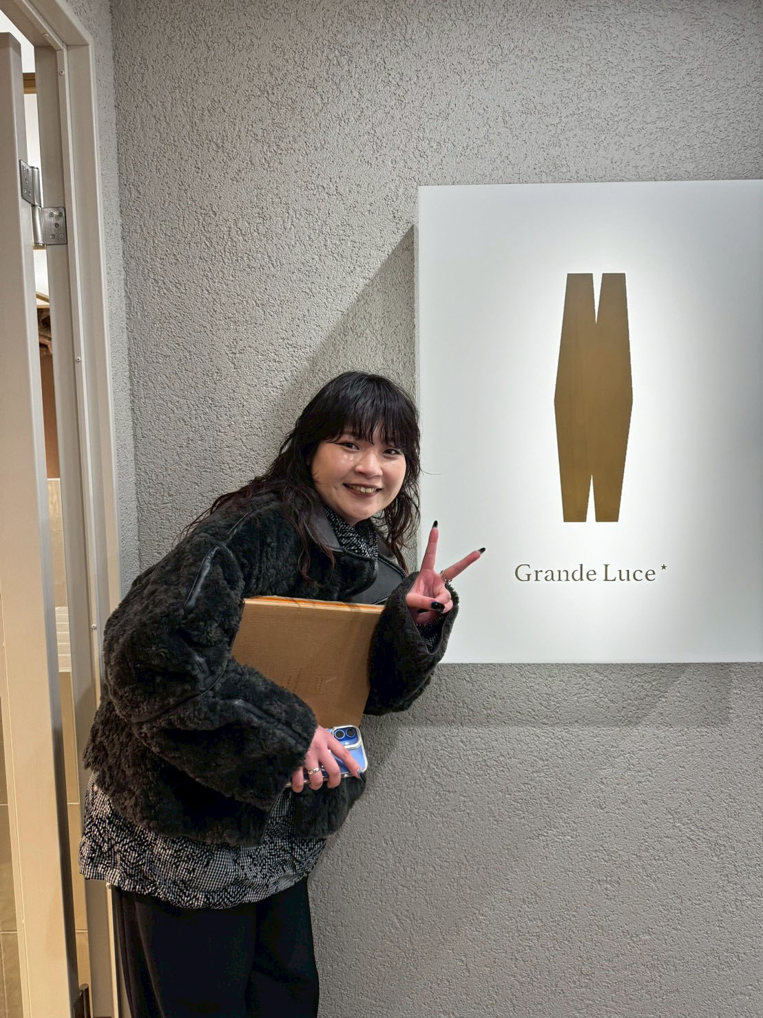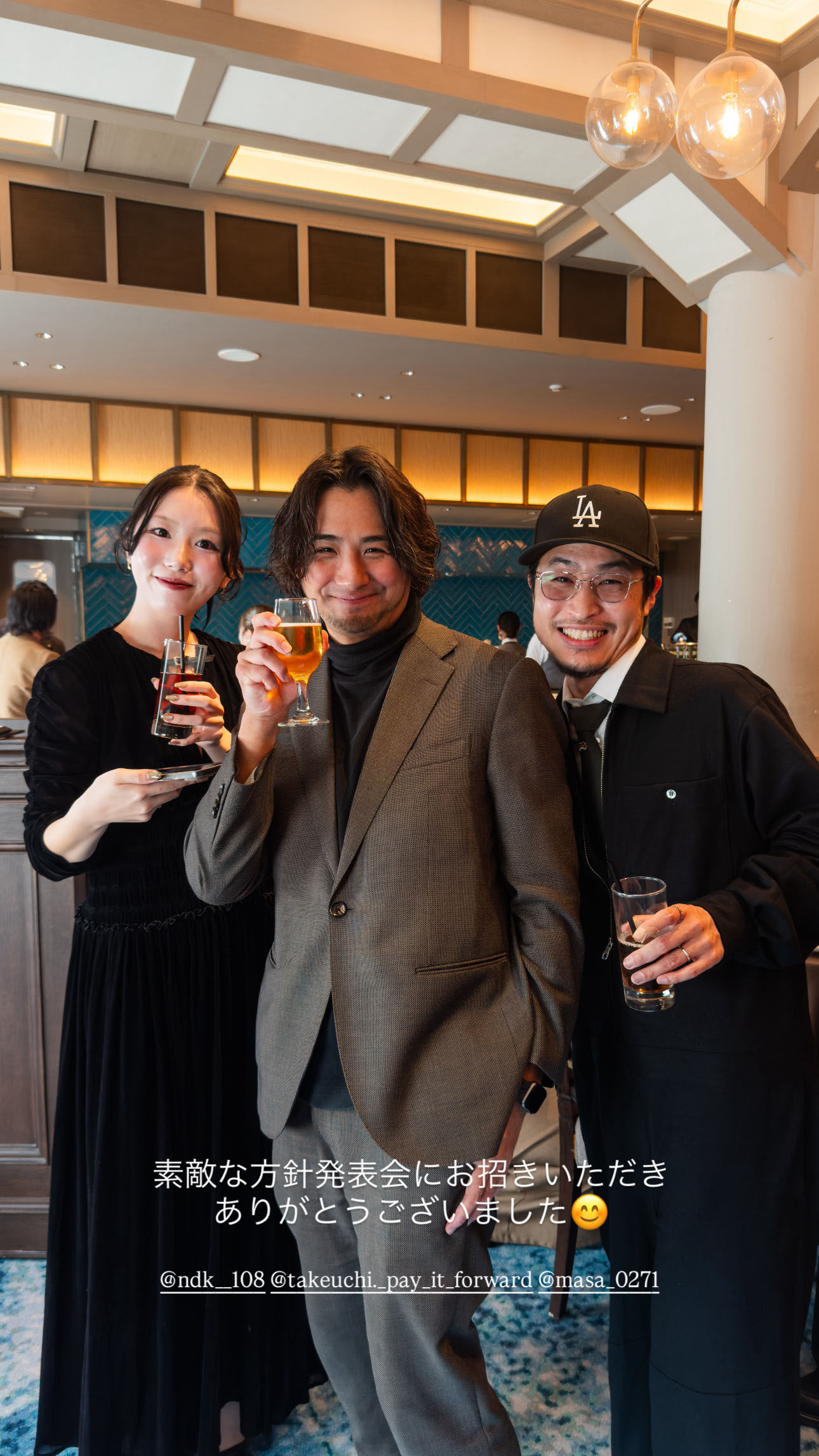 そしてそんなPAY IT FORWARDさんの新店舗「Grand Luce」のレセプションへはロゴデザインを担当した萌ちゃんとカトさんと小澤さんで参加。小澤さんと萌ちゃんの夜は長そう🍻