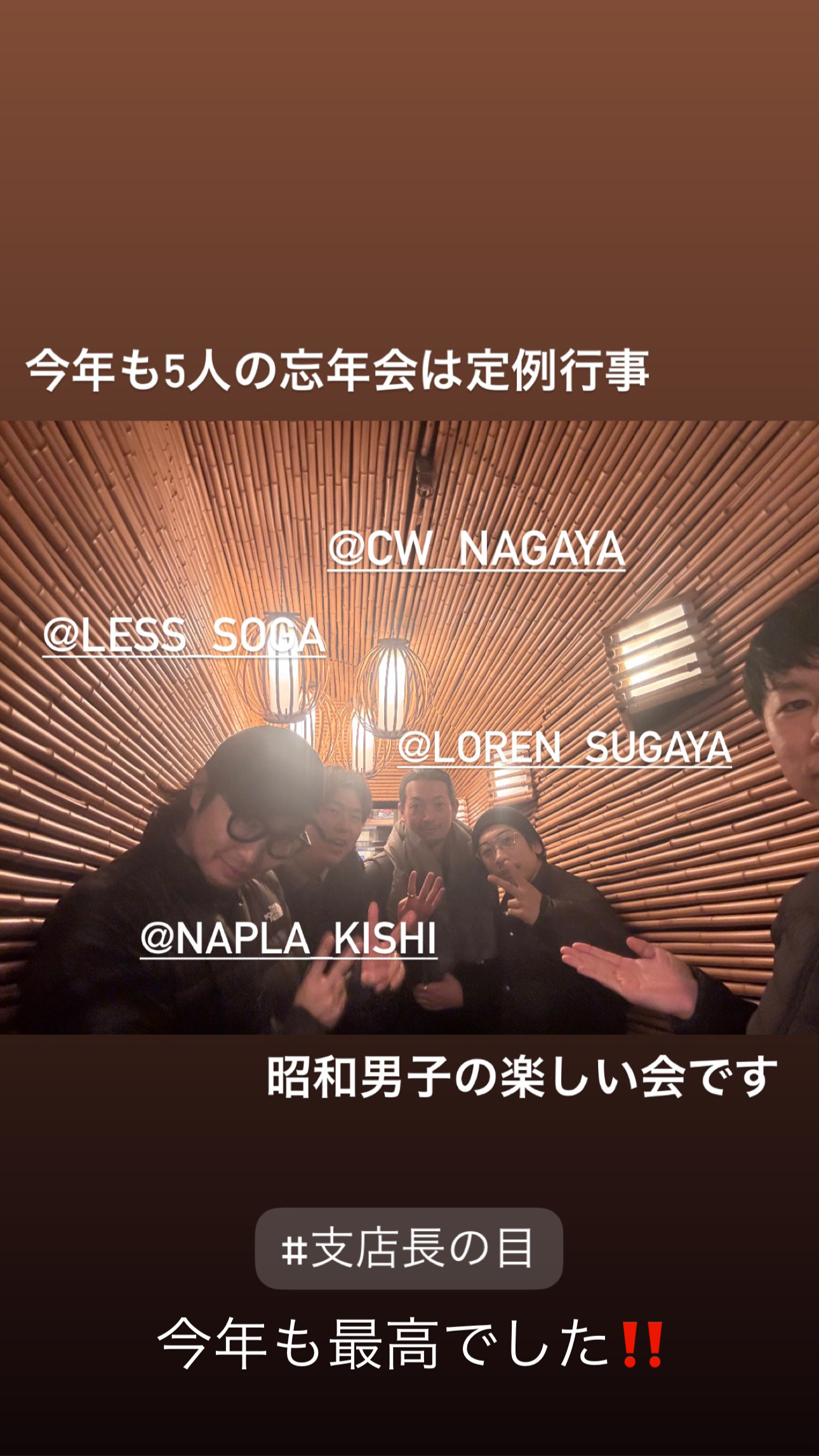 1件目は毎年恒例のLOREN菅谷さん&LESS曽我さん、GAMO保谷さん、napla岸さんとの忘年会。