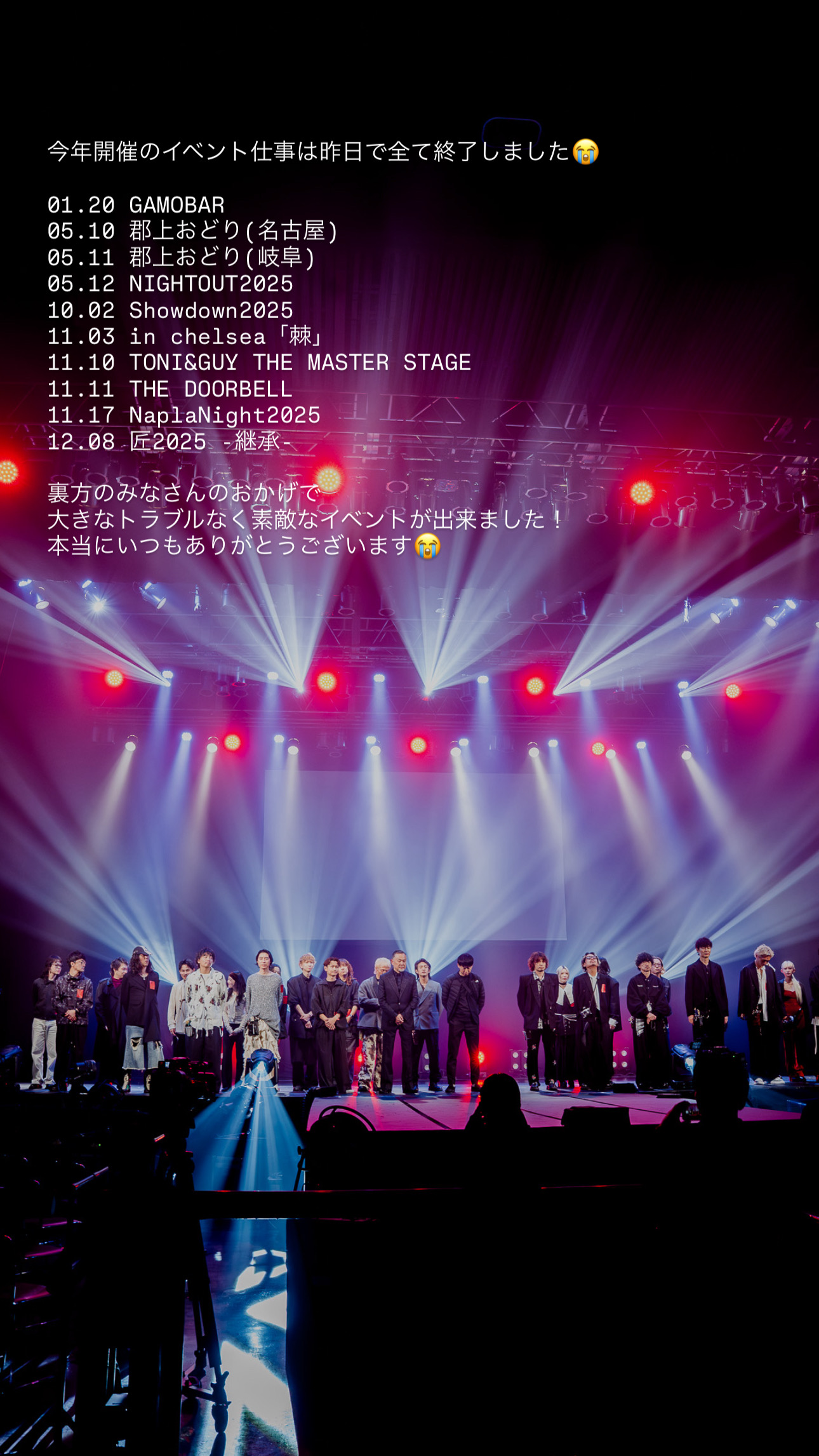 はい、でもそれくらい達成感ありました!多分今後一つのイベントには揃わないであろう12サロンのラインナップと、さらには全サロンオーナーがステージに立つという本当に豪華なイベントというプレッシャーの中、それに負けない演出ができたのではないでしょうか⁉︎ちょっと多めに写真で振り返っておきます!特に普段見れないリハーサルの模様を!
